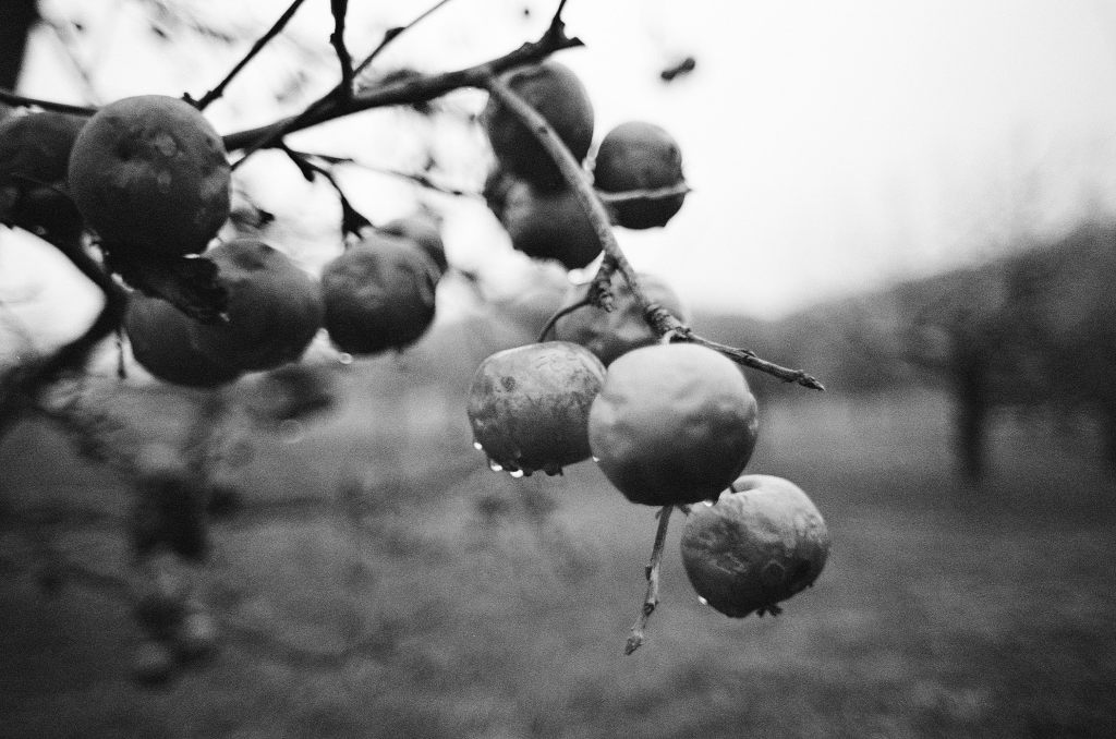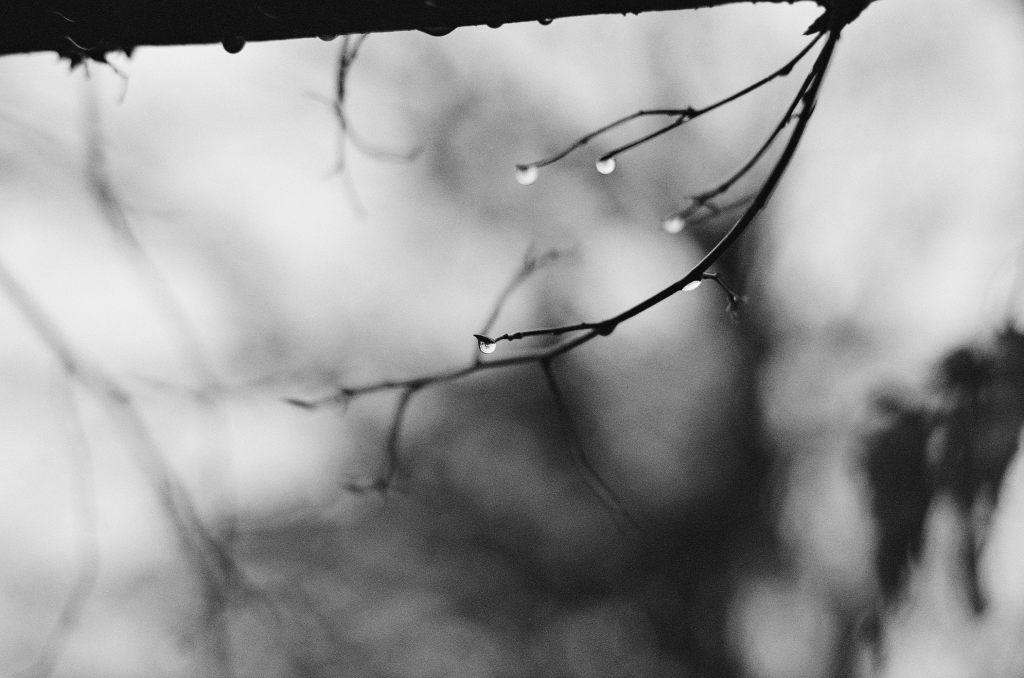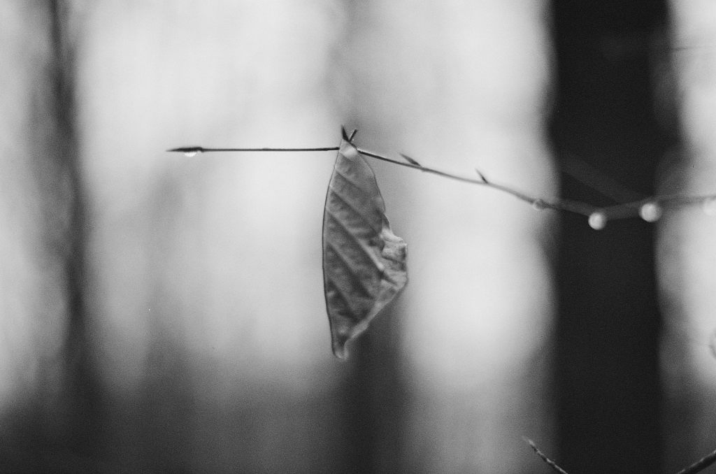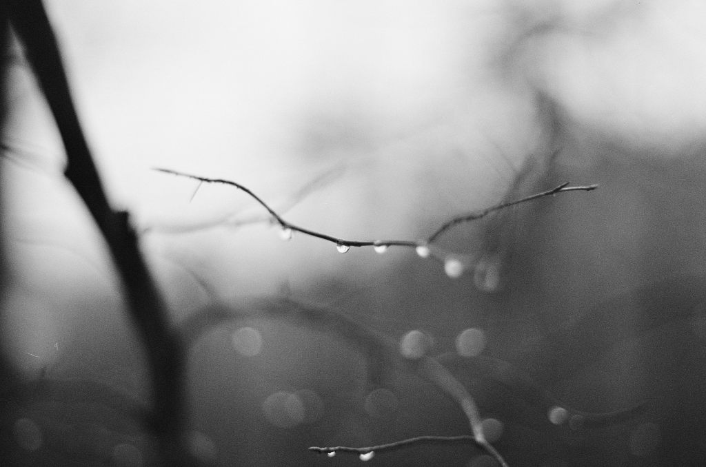 Ende November war ich auf einem Revival-Walk in der fränkischen Schweiz mit Freunden aus einer früheren Fotogruppe hier in Erlangen. Heute würde man die Gruppe wohl ein Kollektiv oder Kombinat nennen – wir nannten uns damals einfach „Die Fotobrauer“. Im ersten Teil hab ich bereits vom Lomo Color’92 berichtet, den ich dabei zuerst noch in der Kamera hatte. Im Lauf des gemeinsamen Spaziergangs wurde dann auf den Ilford gewechselt. Es war an dem Tag sehr grau und dazu auch immer wieder nass. Kein Dauerregen, aber irgendwie war dauernd Feuchtigkeit in der Luft. Daher waren Tropfen im Wald dann auch durchaus mal interessant: