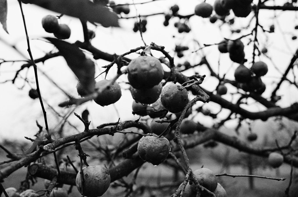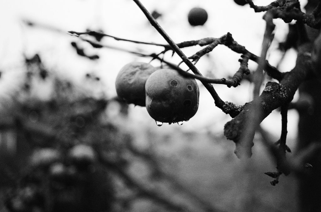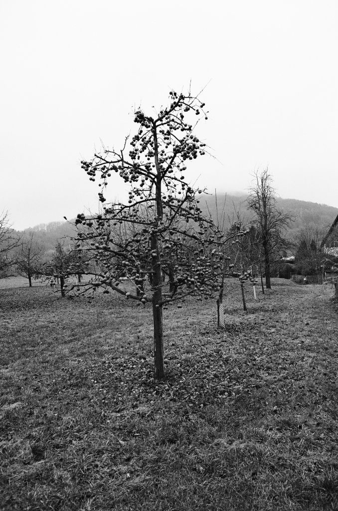 Nachdem wir im örtlichen Lokal eingekehrt waren und uns gestärkt hatten ging es zurück zum außerhalb gelegenen Parkplatz. Auf dem Weg sind wir auf eine Wiese mit einem Apfelbaum getroffen, der wohl bei der Ernte übersehen wurde. Die Äpfel waren alle längst durch den Frost und die Witterung völlig hinüber, dennoch hingen sie immer noch fest an dem Baum: