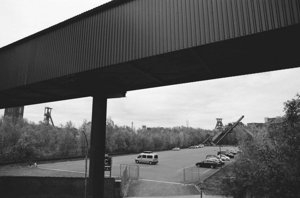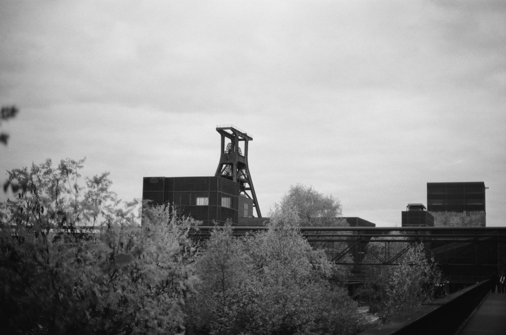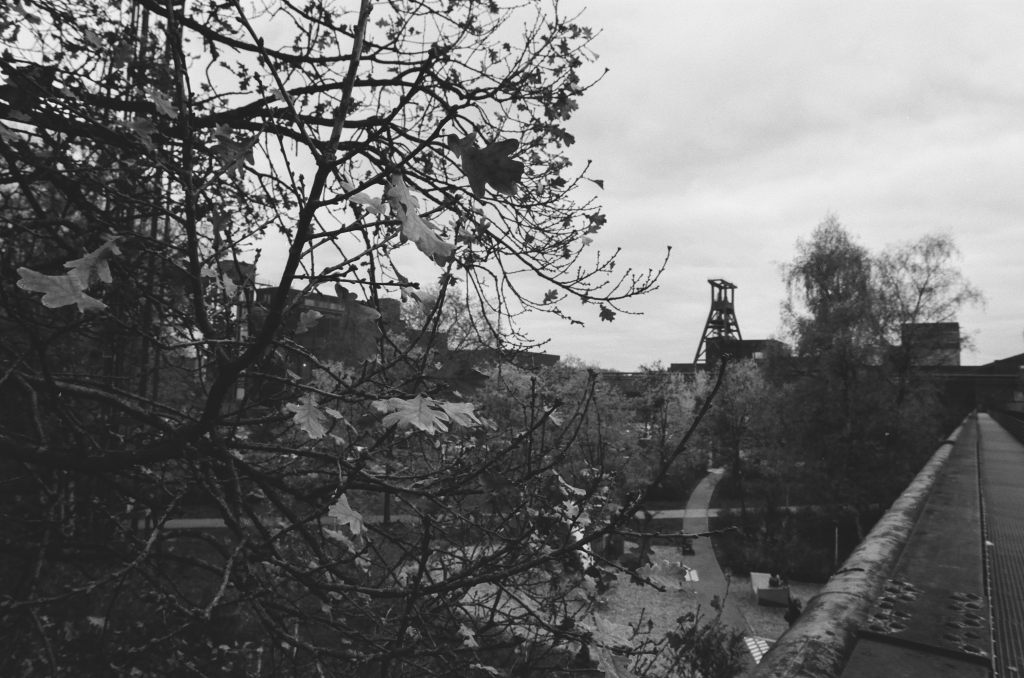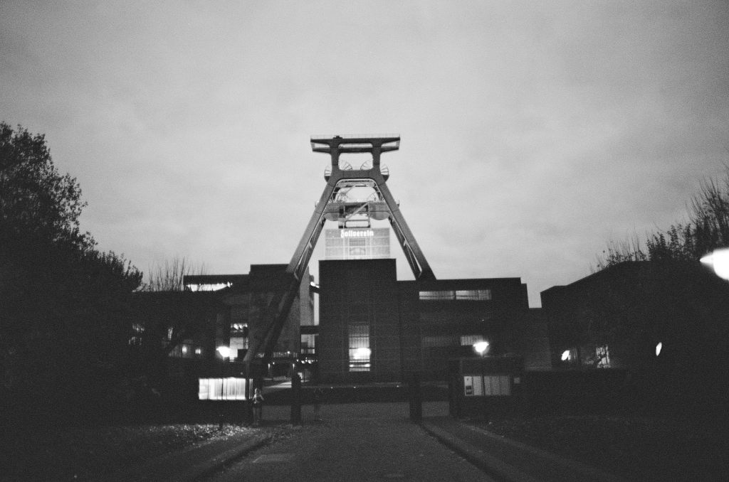 Zum Ende meines Besuchs in der Zeche musste ich nochmal den Film wechseln und habe einen Ilford XP2 400 eingelegt. Mit der beginnenden Dämmerung war es mangels Stativ auch ein guter Moment, einen etwas lichtstärkeren Film einzulegen. So gab es zum Abschluss nochmal einen Blick auf die beleuchtete Zeche: