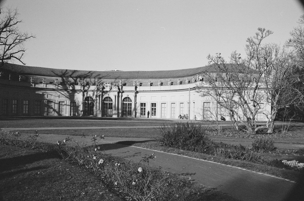 Hier ein Blick auf die Orangerie im Erlanger Schloßgarten. Das Gebäude ist sicher eins der echten Hingucker bei uns in der Stadt. Mit einem passenden Farbfilter am Objektiv lässt sich vielleicht das schöne Orange des Gebäudes noch etwas besser herausstellen (alternativ wäre ein Farbfilm natürlich einfacher).