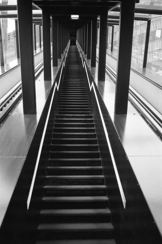 Diese Treppe wirkt natürlich noch ganz anders in Farbe – besonders in der Dämmerung. Da ist der Blitz rechts uns links der Treppe ein kräftiges Orange. Und die beiden Rolltreppen rechts und links der Treppe vermitteln das Gefühl, mitten in einem Lavafluß zu stehen – oder in einem Stahlwerk, was natürlich an diesem Ort auch sehr naheliegend ist (wer mag kann ja mal einen Blick riskieren auf das Foto – das hab ich dort mit meiner Fuji gemacht, aber digitale Fotografie ist ja jetzt nicht das Thema von diesem Artikel).